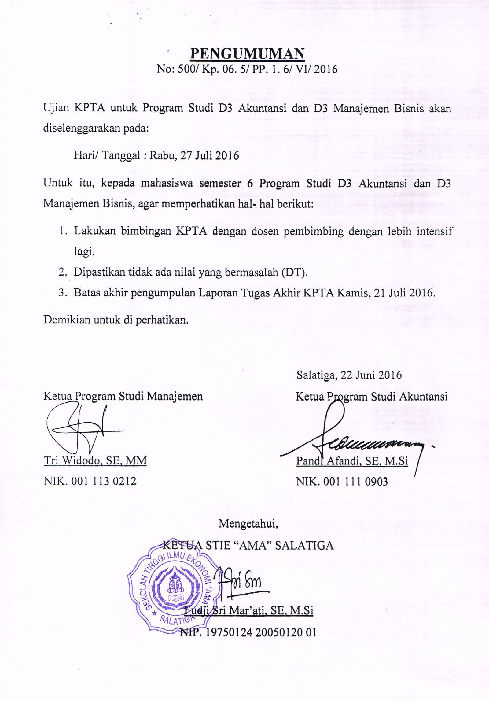 Pengumuman tentang Pelaksanaan Ujian KPTA untuk Program Studi D3 Manajemen dan D3 Akuntansi