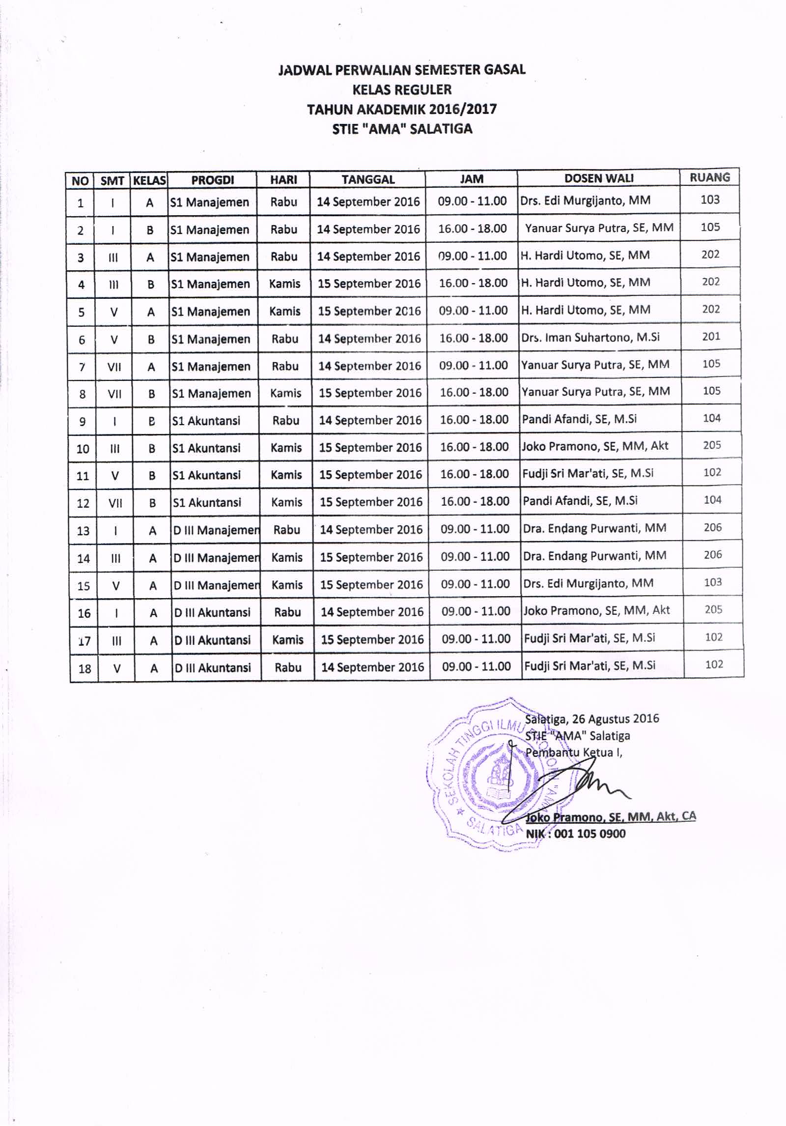 Jadwal perwalian Mahasiswa Lama dan Baru kelas Reguler Th. Akademik 2016/2017 Gasal