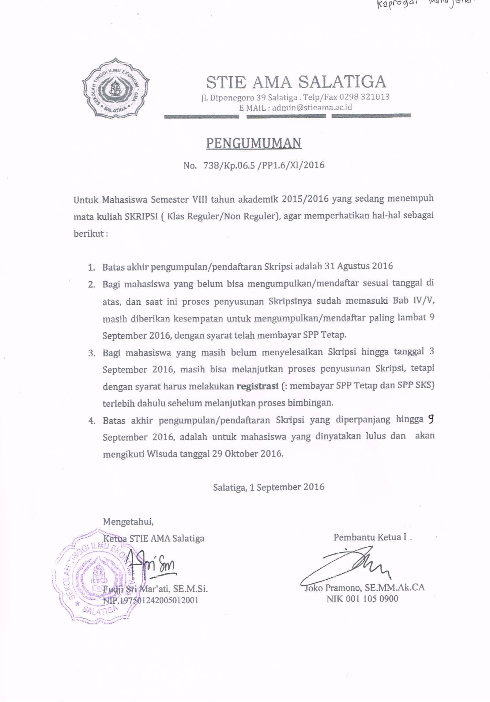 Untuk seluruh mahasiswa semester VIII tahun akademik 2015/2016 yang sedang menempuh mata kuliah SKRIPSI (Kelas Reguler / NonReguler) agar memperhatikan hal-hal sebagai berikut :