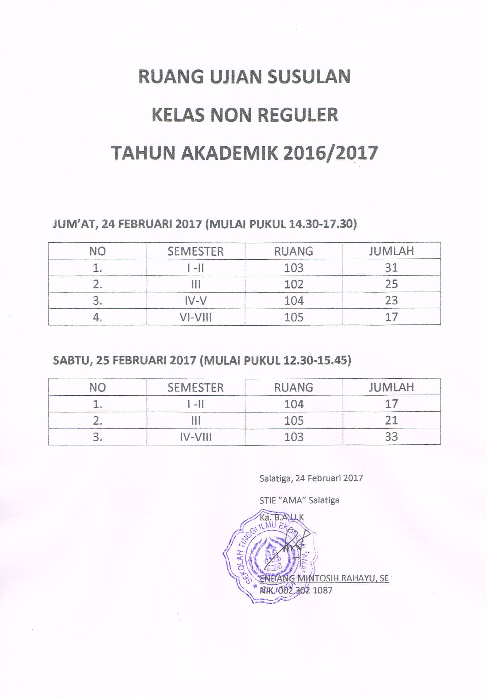 Jadwal Ruang Ujian Susulan Kelas NonReguler Th. Akademik 2016/2017