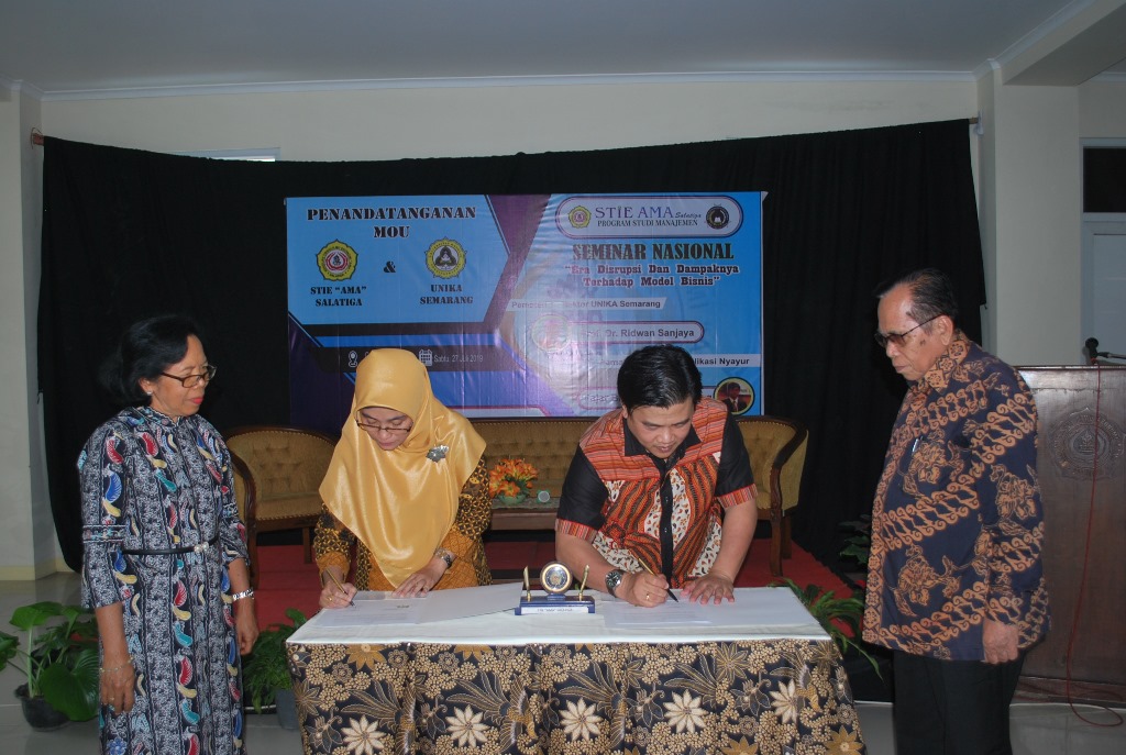 Sementara itu, sebelumnya seminar dimulai, dilakukan penandatanganan kerja sama pendidikan antara Ketua STIE AMA Salatiga Fudji Sri Mar’ati SE MSi, dengan Rektor Unika Prof Dr Ridwan Sanjaya. Bersamaan dengan itu, STIE AMA Salatiga baru saja meraih Akreditasi B Prodi S1 Akuntansi, berdasarkan keputusan Badan Akreditasi Nasional Perguruan Tinggi (BAN PT) tertanggal 23 Juli 2019. Ketua STIE AMA Salatiga Fudji Sri Mar’ati menjelaskan hasil akreditasi ini sebagai pendorong peningkatan kulitas STIE AMA sebagai perguruan tinggi. STIE AMA Salatiga masih membuka kesempatan pendaftaran siswa baru untuk sejumlah program yang ditawarkan, yakni S1 Manajemen, D3 Manajemen, S1 Akuntansi, dan D3 Akuntansi. (H2-68)