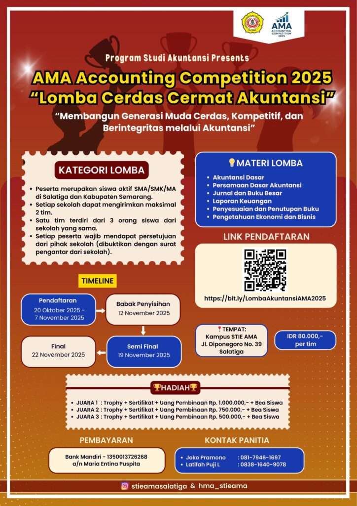 Program Studi Akuntansi STIE AMA Salatiga kembali menggelar ajang bergengsi AMA Accounting Competition 2025 dengan tema “Membangun Generasi Muda Cerdas, Kompetitif, dan Berintegritas melalui Akuntansi.”